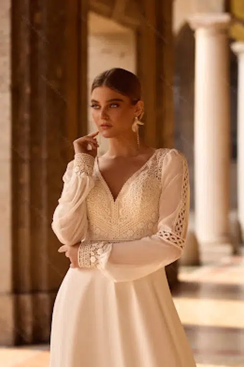 Boho-Kleider sind in der Regel aus leichten, natürlichen Stoffen wie Chiffon, weichem Tüll oder komplett aus Spitze (All-over Boho-Chic) gefertigt. Der Farbton muss nicht immer reines Weiß sein – auch sanfte Creme- oder Nude-Nuancen unterstreichen den organischen Charme dieser Stilrichtung.